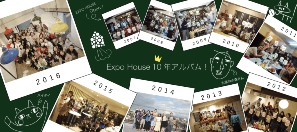 2007년에 Expo Houses는 오픈했습니다. 쉐어하우스를 시작한 계기는 같이 밥을 먹고, 놀고, 목욕탕에 갈 외국인, 유학생 친구를 갖고 싶었기 때문입니다. 처음 입주한 사람은 필리핀에서 온 유학생이었습니다. 하루는 걱정을 안고 하우스에 돌아왔을 때, 그 친구가 따뜻한 차를 건네주며 이야기를 들어 주었습니다. 그 관계는 가족도 친구도 아닌, 같이 사는 최고의 쉐어메이트 관계였습니다. 우리는 지금도 1년에 몇 번씩 이야기를 나누고, 필리핀 집에도 놀러 갑니다. 그리고 많은 나라에서 사람들이 왔습니다. 많은 일본 사람들도 입주했습니다. 같이 생활한 기간이 길지는 않지만, 따로 떨어져 살게 되더라도 평생 함께 할, 그런 쉐어메이트 관계를 만들 수 있는 장소가 되도록 노력하겠습니다.